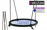 Качели-гнездо Midzumi выполнены из металлической рамы диаметром 100 сантиметров, с дополнительной защитной оплеткой ее бортиков, обтянутых прочным синтетическим канатом толщиной 10 мм выдерживающим нагрузку 100 кг. Плетеное синтетическое сидение качелей удобное и практичное, не собирает грязь и воду, при сильных загрязнениях его можно протереть.